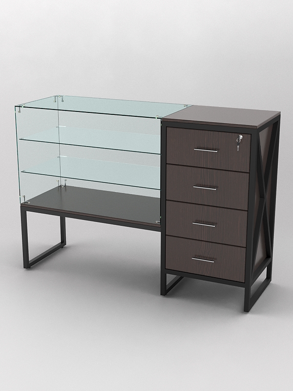 Верхняя часть стеклянная и оснащена двумя стеклянными полками. Стеклянные полки на прилавках служат для демонстрации товаров. Они позволяют покупателям видеть товар, не прикасаясь к нему, что обеспечивает его сохранность и презентабельный вид. Кроме того, стеклянные полки придают прилавку более элегантный вид и делают его более функциональным. Прилавок со стеклянными полками может быть полезен в магазинах, где необходимо демонстрировать товары. Например, это могут быть магазины ювелирных изделий, часов, аксессуаров, а также магазины косметики и парфюмерии.
