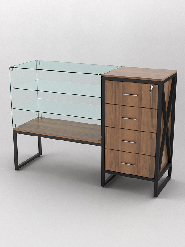 Верхняя часть стеклянная и оснащена двумя стеклянными полками. Стеклянные полки на прилавках служат для демонстрации товаров. Они позволяют покупателям видеть товар, не прикасаясь к нему, что обеспечивает его сохранность и презентабельный вид. Кроме того, стеклянные полки придают прилавку более элегантный вид и делают его более функциональным. Прилавок со стеклянными полками может быть полезен в магазинах, где необходимо демонстрировать товары. Например, это могут быть магазины ювелирных изделий, часов, аксессуаров, а также магазины косметики и парфюмерии.