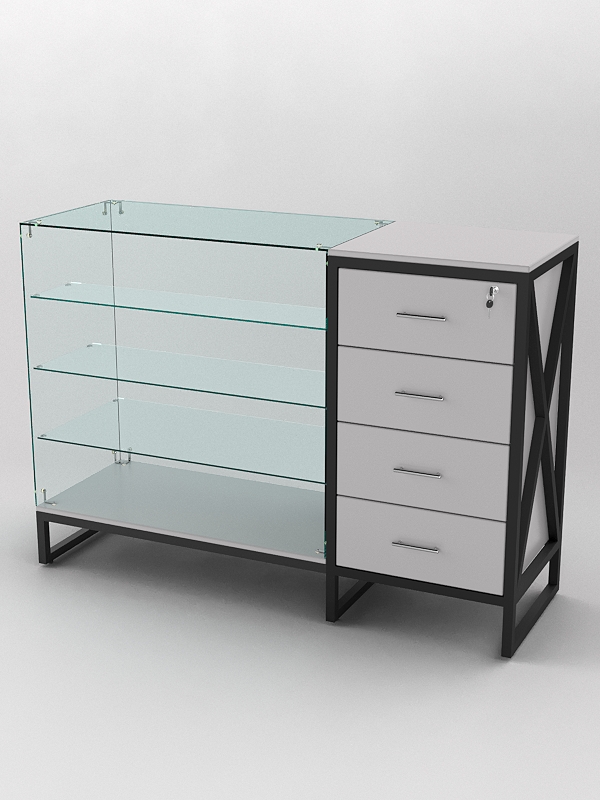 Верхняя часть стеклянная и оснащена тремя стеклянными полками. Стеклянные полки на прилавках служат для демонстрации товаров. Они позволяют покупателям видеть товар, не прикасаясь к нему, что обеспечивает его сохранность и презентабельный вид. Кроме того, стеклянные полки придают прилавку более элегантный вид и делают его более функциональным. Прилавок со стеклянными полками может быть полезен в магазинах, где необходимо демонстрировать товары. Например, это могут быть магазины ювелирных изделий, часов, аксессуаров, а также магазины косметики и парфюмерии.