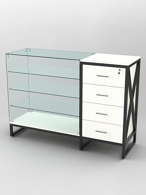 Верхняя часть стеклянная и оснащена тремя стеклянными полками. Стеклянные полки на прилавках служат для демонстрации товаров. Они позволяют покупателям видеть товар, не прикасаясь к нему, что обеспечивает его сохранность и презентабельный вид. Кроме того, стеклянные полки придают прилавку более элегантный вид и делают его более функциональным. Прилавок со стеклянными полками может быть полезен в магазинах, где необходимо демонстрировать товары. Например, это могут быть магазины ювелирных изделий, часов, аксессуаров, а также магазины косметики и парфюмерии.