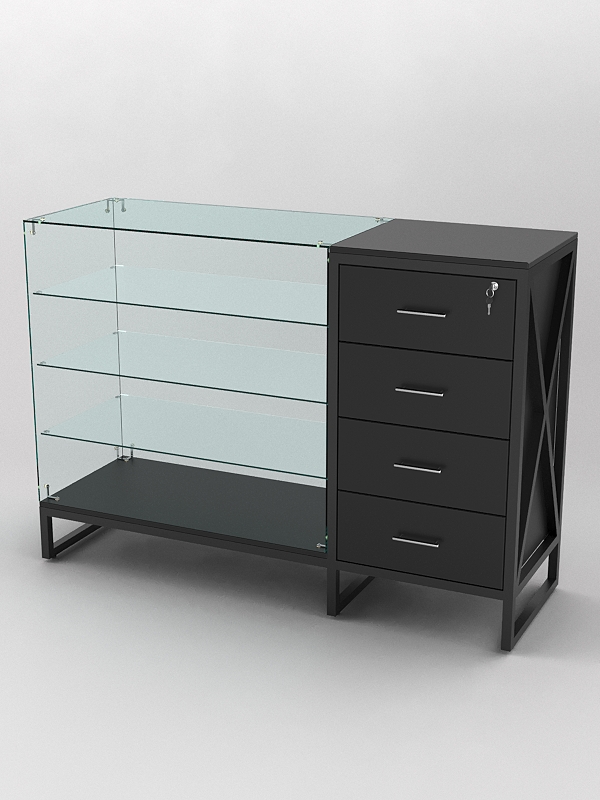 Верхняя часть стеклянная и оснащена тремя стеклянными полками. Стеклянные полки на прилавках служат для демонстрации товаров. Они позволяют покупателям видеть товар, не прикасаясь к нему, что обеспечивает его сохранность и презентабельный вид. Кроме того, стеклянные полки придают прилавку более элегантный вид и делают его более функциональным. Прилавок со стеклянными полками может быть полезен в магазинах, где необходимо демонстрировать товары. Например, это могут быть магазины ювелирных изделий, часов, аксессуаров, а также магазины косметики и парфюмерии.