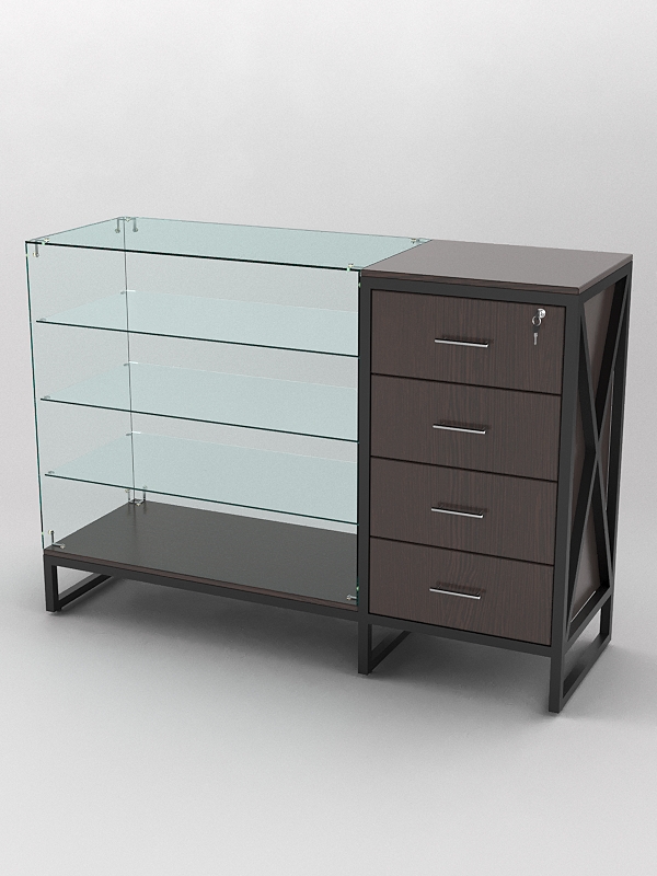 Верхняя часть стеклянная и оснащена тремя стеклянными полками. Стеклянные полки на прилавках служат для демонстрации товаров. Они позволяют покупателям видеть товар, не прикасаясь к нему, что обеспечивает его сохранность и презентабельный вид. Кроме того, стеклянные полки придают прилавку более элегантный вид и делают его более функциональным. Прилавок со стеклянными полками может быть полезен в магазинах, где необходимо демонстрировать товары. Например, это могут быть магазины ювелирных изделий, часов, аксессуаров, а также магазины косметики и парфюмерии.
