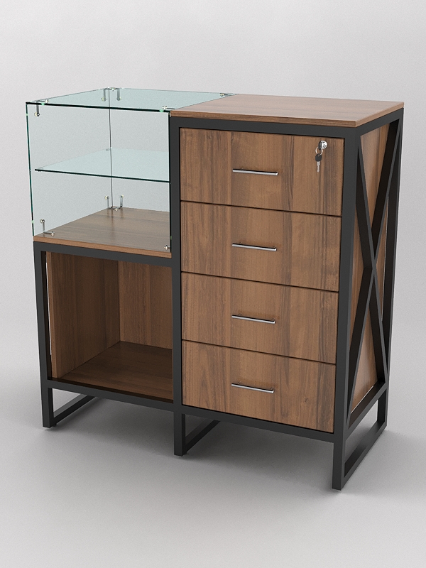 Верхняя часть стеклянная и оснащена стеклянной полкой. Стеклянная полка прилавка служит для демонстрации товаров. Они позволяют покупателям видеть товар, не прикасаясь к нему, что обеспечивает его сохранность и презентабельный вид. Кроме того, стеклянные полки придают прилавку более элегантный вид и делают его более функциональным. Прилавок со стеклянными полками может быть полезен в магазинах, где необходимо демонстрировать товары. Например, это могут быть магазины ювелирных изделий, часов, аксессуаров, а также магазины косметики и парфюмерии.