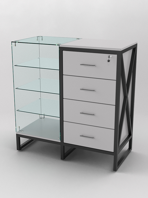 Верхняя часть стеклянная и оснащена тремя стеклянными полками. Стеклянные полки прилавка служит для демонстрации товаров. Они позволяют покупателям видеть товар, не прикасаясь к нему, что обеспечивает его сохранность и презентабельный вид. Кроме того, стеклянные полки придают прилавку более элегантный вид и делают его более функциональным. Прилавок со стеклянными полками может быть полезен в магазинах, где необходимо демонстрировать товары. Например, это могут быть магазины ювелирных изделий, часов, аксессуаров, а также магазины косметики и парфюмерии.