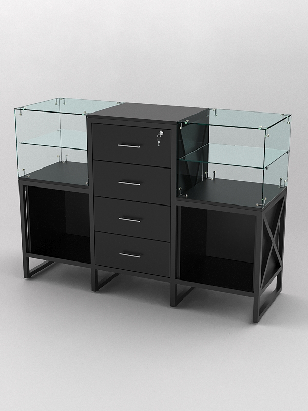 Также конструкция оснащена двумя стеклеными полками, вокруг которых имеется стеклянное основание. Эта стеклянная система позволяет покупателям видеть товар, не прикасаясь к нему, что обеспечивает его сохранность и презентабельный вид. Кроме того, стеклянные полки придают прилавку более элегантный вид и делают его более функциональным. Прилавок со стеклянными полками может быть полезен в магазинах, где необходимо демонстрировать товары. Например, это могут быть магазины ювелирных изделий, часов, аксессуаров, а также магазины косметики и парфюмерии.