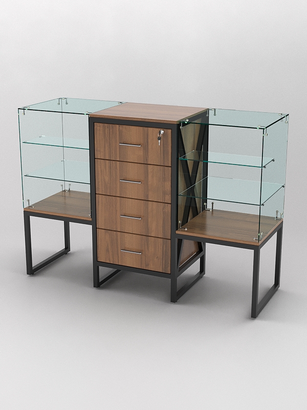 Также конструкция оснащена четырьмя стеклянными полками, вокруг которых имеется стеклянное основание. Эта стеклянная система позволяет покупателям видеть товар, не прикасаясь к нему, что обеспечивает его сохранность и презентабельный вид. Кроме того, стеклянные полки придают прилавку более элегантный вид и делают его более функциональным. Прилавок со стеклянными полками может быть полезен в магазинах, где необходимо демонстрировать товары. Например, это могут быть магазины ювелирных изделий, часов, аксессуаров, а также магазины косметики и парфюмерии.