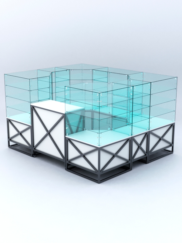 Павильон предназначен для расположения в центре зала, имеет прямоугольную форму и просматривается с 4-х сторон. Со стороны продавца витрины закрытые. Чаще всего используют в торговых центрах.