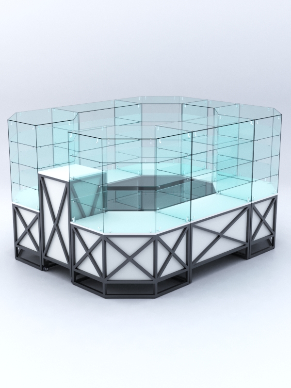 Павильон предназначен для расположения в центре зала, имеет прямоугольную форму и просматривается с 4-х сторон. Со стороны продавца витрины открытые. Чаще всего используют в торговых центрах.