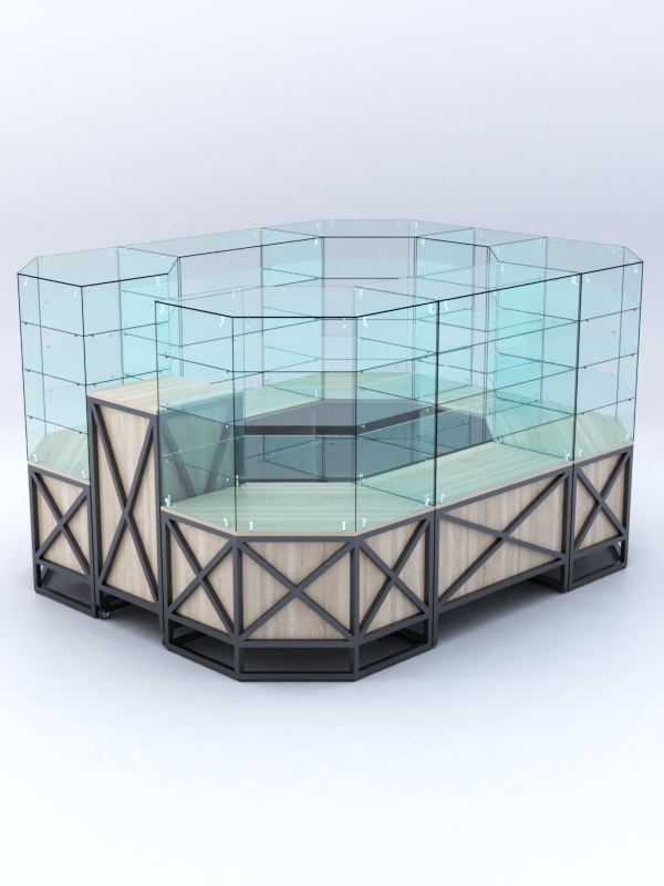 Павильон предназначен для расположения в центре зала, имеет прямоугольную форму и просматривается с 4-х сторон. Со стороны продавца витрины открытые. Чаще всего используют в торговых центрах.