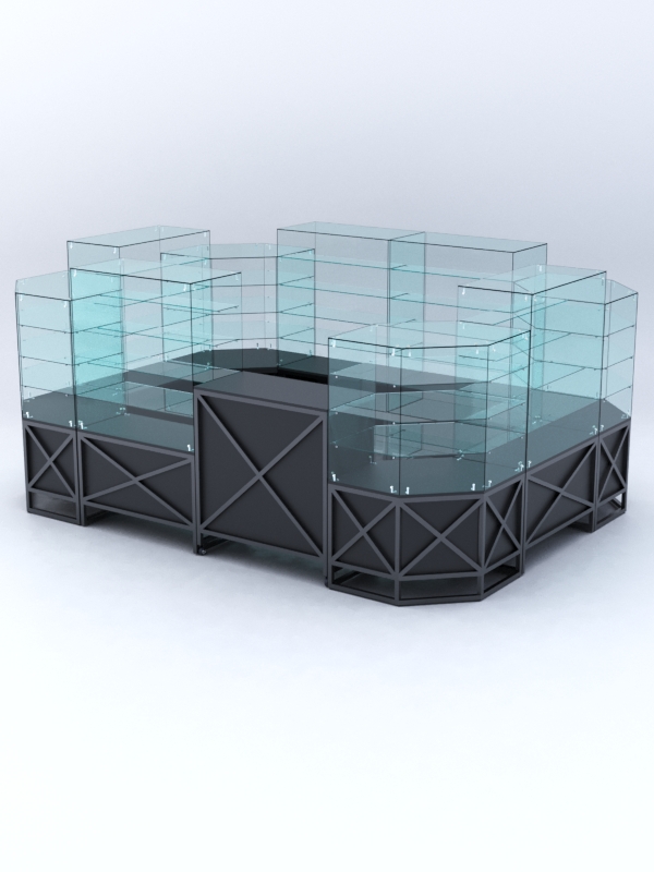 Данная модель предназначена для расположения в центре зала, имеет прямоугольную форму и просматривается с 4-х сторон. Со стороны продавца витрины открытые. Такое оборудование можно установить в торговом центре.