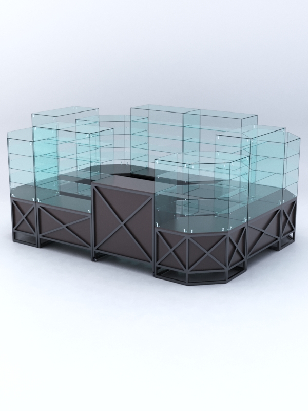 Данная модель предназначена для расположения в центре зала, имеет прямоугольную форму и просматривается с 4-х сторон. Со стороны продавца витрины открытые. Такое оборудование можно установить в торговом центре.