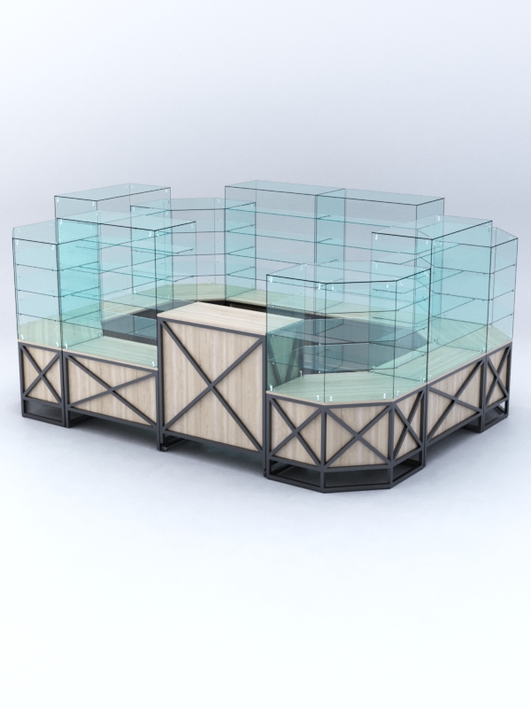 Данная модель предназначена для расположения в центре зала, имеет прямоугольную форму и просматривается с 4-х сторон. Со стороны продавца витрины открытые. Такое оборудование можно установить в торговом центре.