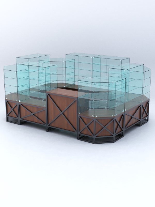 Данная модель предназначена для расположения в центре зала, имеет прямоугольную форму и просматривается с 4-х сторон. Со стороны продавца витрины закрытые. Такое оборудование можно установить в торговом центре.