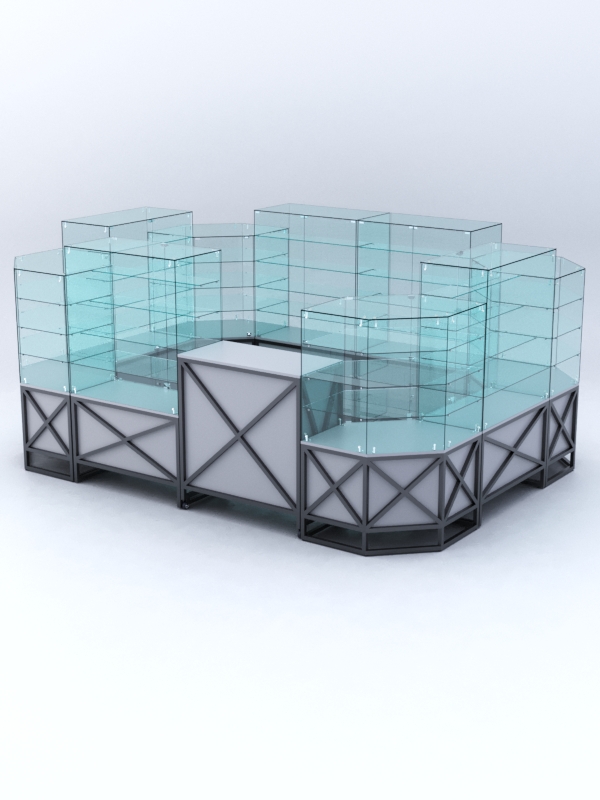 Данная модель предназначена для расположения в центре зала, имеет прямоугольную форму и просматривается с 4-х сторон. Со стороны продавца витрины закрытые. Такое оборудование можно установить в торговом центре.