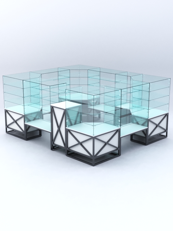 Данная модель предназначена для расположения в центре зала, имеет прямоугольную форму и просматривается с 4-х сторон. Со стороны продавца витрины открытые. Такое оборудование можно установить в торговом центре.
