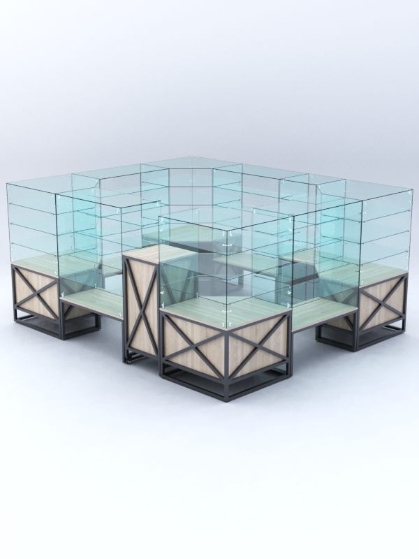 Данная модель предназначена для расположения в центре зала, имеет прямоугольную форму и просматривается с 4-х сторон. Со стороны продавца витрины открытые. Такое оборудование можно установить в торговом центре.