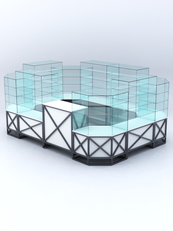 Данная модель предназначена для расположения в центре зала, имеет прямоугольную форму и просматривается с 4-х сторон. Со стороны продавца витрины открытые. Такое оборудование можно установить в торговом центре.