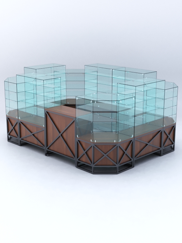 Данная модель предназначена для расположения в центре зала, имеет прямоугольную форму и просматривается с 4-х сторон. Со стороны продавца витрины закрытые. Такое оборудование можно установить в торговом центре.