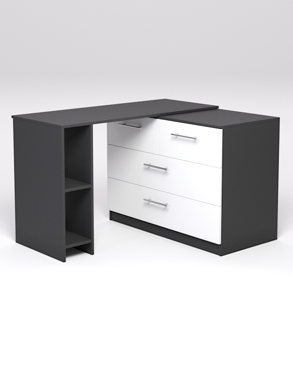 Стол для тех, кто предъявляет особенные требования к рабочему пространству. Представляет собой сочетание столешницы и комода. Главной особенностью модели является то, что он может складываться — столешница поворачивается на 360 градусов. Изделие многофункциональное, удобное, универсальное и впишется в интерьер любой комнаты. Модель отличается большим количеством мест для хранения. Имеются четыре ящика в комоде и пространство с полкой в столешнице, где разместятся все необходимые для учебы, хобби или работы вещи и просто мелочи, которые нужно куда-то прятать. Стол с легкостью можно разместить в малогабаритном помещении, а также с помощью него можно зонировать пространство.