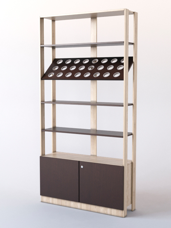 Витрина для магазина табака. Отличный вариант для демонстрации кальянной продукции, а также сопутствующих товаров и аксессуаров. Изделие оснащено тремя горизонтальными полками и наклоненной полкой с прорезями, где удобно демонстрировать блюдца. В нижней части имеется тумба накопитель, где лучше всего хранить продукцию.