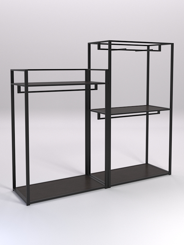 Вешало для одежды. Конструкция оснащена тремя штангами, расположенными на разных высотах. Штанги предназначены для вешалок. Отличный вариант для демонстрации одежды. Самое-то для шоурумов и магазинов одежды.