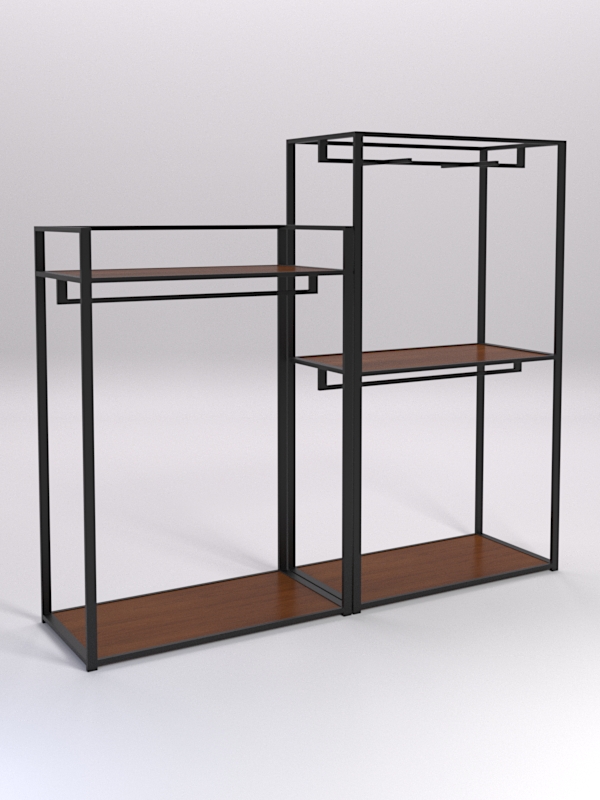 Вешало для одежды. Конструкция оснащена тремя штангами, расположенными на разных высотах. Штанги предназначены для вешалок. Отличный вариант для демонстрации одежды. Самое-то для шоурумов и магазинов одежды.
