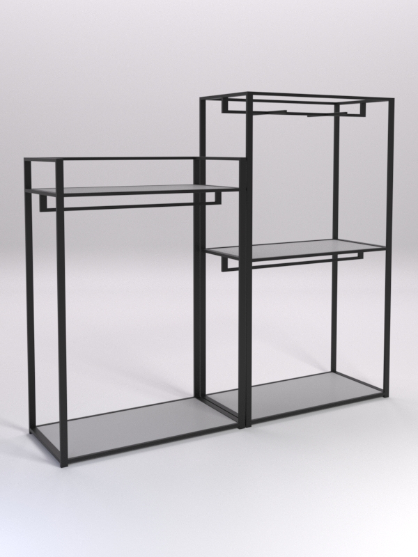 Вешало для одежды. Конструкция оснащена тремя штангами, расположенными на разных высотах. Штанги предназначены для вешалок. Отличный вариант для демонстрации одежды. Самое-то для шоурумов и магазинов одежды.