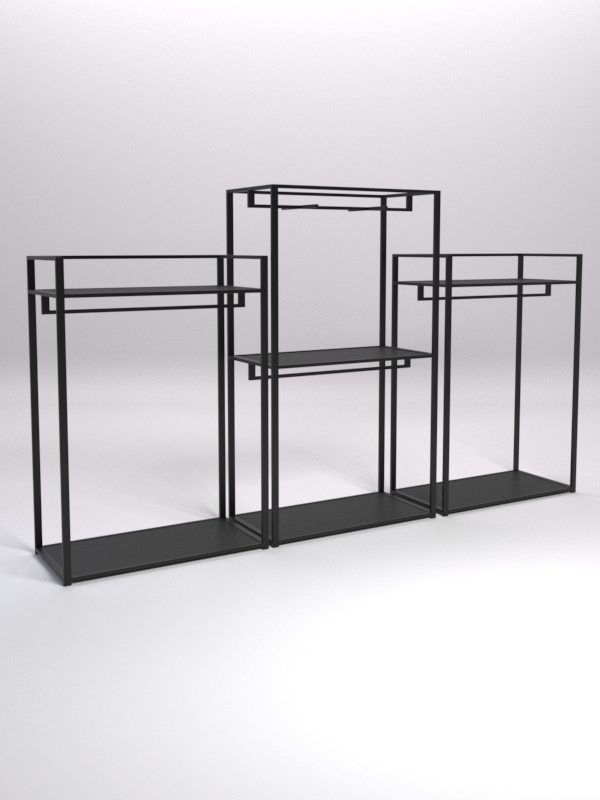 Вешало для одежды. Конструкция оснащена четырьмя штангами, расположенными на разных высотах. Штанги предназначены для вешалок. Отличный вариант для демонстрации одежды. Самое-то для шоурумов и магазинов одежды.