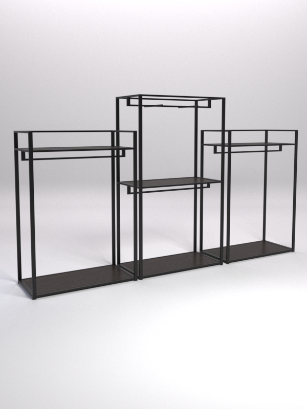 Вешало для одежды. Конструкция оснащена четырьмя штангами, расположенными на разных высотах. Штанги предназначены для вешалок. Отличный вариант для демонстрации одежды. Самое-то для шоурумов и магазинов одежды.
