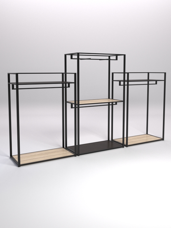 Вешало для одежды. Конструкция оснащена четырьмя штангами, расположенными на разных высотах. Штанги предназначены для вешалок. Отличный вариант для демонстрации одежды. Самое-то для шоурумов и магазинов одежды.