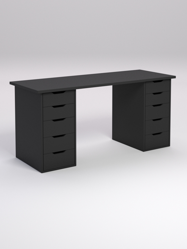 Стол состоит из столешницы и двух тумбочек, состоящих из пяти выдвижных ящиков.
