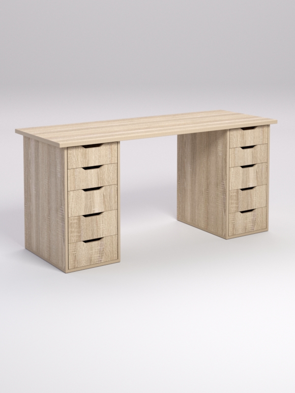 Стол состоит из столешницы и двух тумбочек, состоящих из пяти выдвижных ящиков.