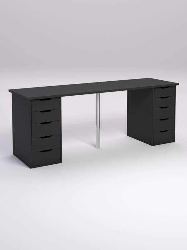 Стол состоит из столешницы и двух тумбочек, состоящих из пяти выдвижных ящиков.