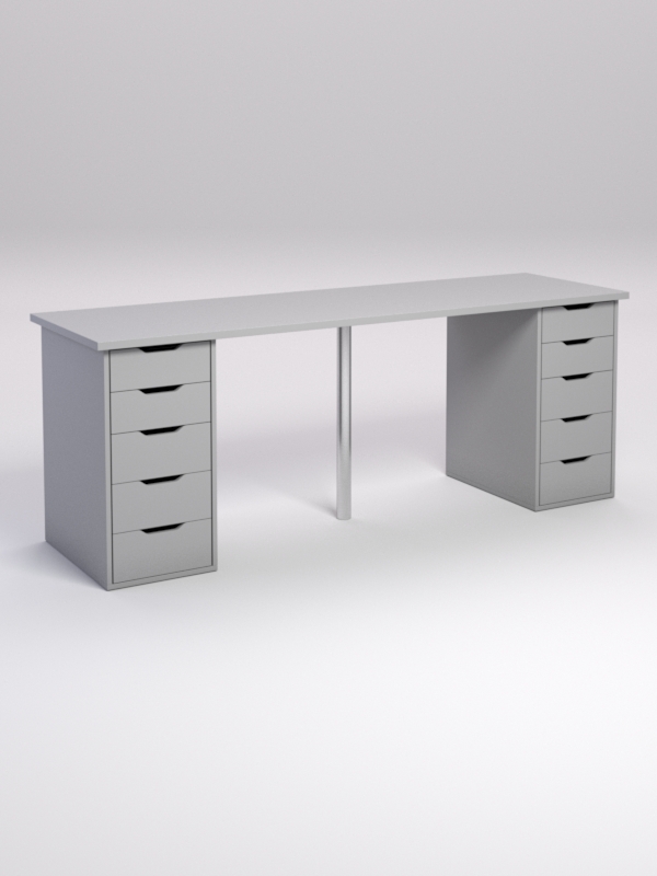 Стол состоит из столешницы и двух тумбочек, состоящих из пяти выдвижных ящиков.
