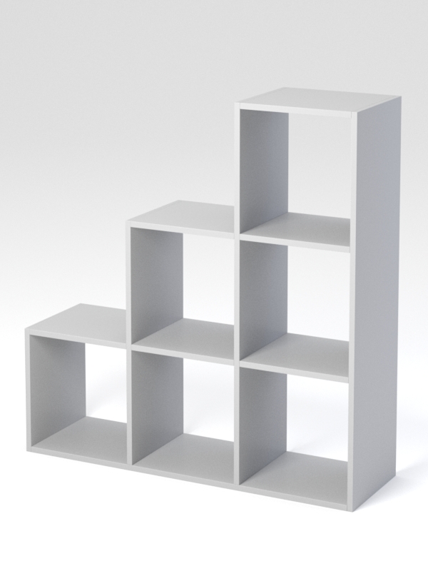 Стеллаж с шестью секциями. Трехуровневый, с разным количеством секций на каждый уровень. Форма треугольная. Отлично вписывается как в интерьер любого помещения. Универсальное использование в различных помещениях: в гостиной, кабинете, офисе, прихожей или спальне. Остроугольные углы добавляют эстетичности и изысканности дизайну полки. Подойдет для размещения различных предметов.