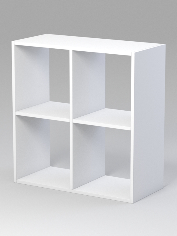 Стеллаж с четырьмя секциями. По форме напоминает квадрат. Отлично вписывается в интерьер квартиры, офиса, общественного пространства и магазинов. Впишется в любой интерьер. Легкая и надежная. Подойдет для хранения и демонстрации различных предметов или элементов декора.