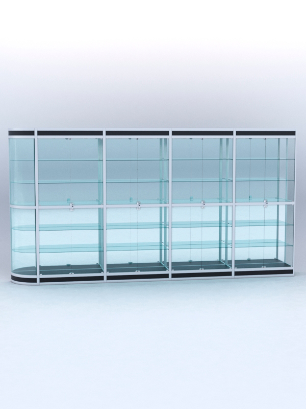 Витрина для кубков пятисекционная. Помимо этого в ней можно демонстрировать медали и грамоты. Витрина украсит любой интерьер. Изготовлена с радиусным с закруглением левой части. Имеется подсветка и дверцы с замком. Задняя стенка зеркальная. Подойдет для большой коллекции.