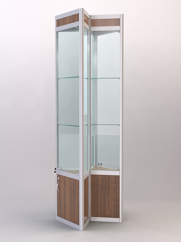 Витрина для кубков и наград. По форме напоминает два треугольника. В нижней части имеется полка с накопителем, где также можно хранить награды. Конструкция прочная и надежная. Выставочная мебель также имеет подсветку в верхней части. Двухсекционная. Две стеклянные полки. Может поместиться до 6 кубков.