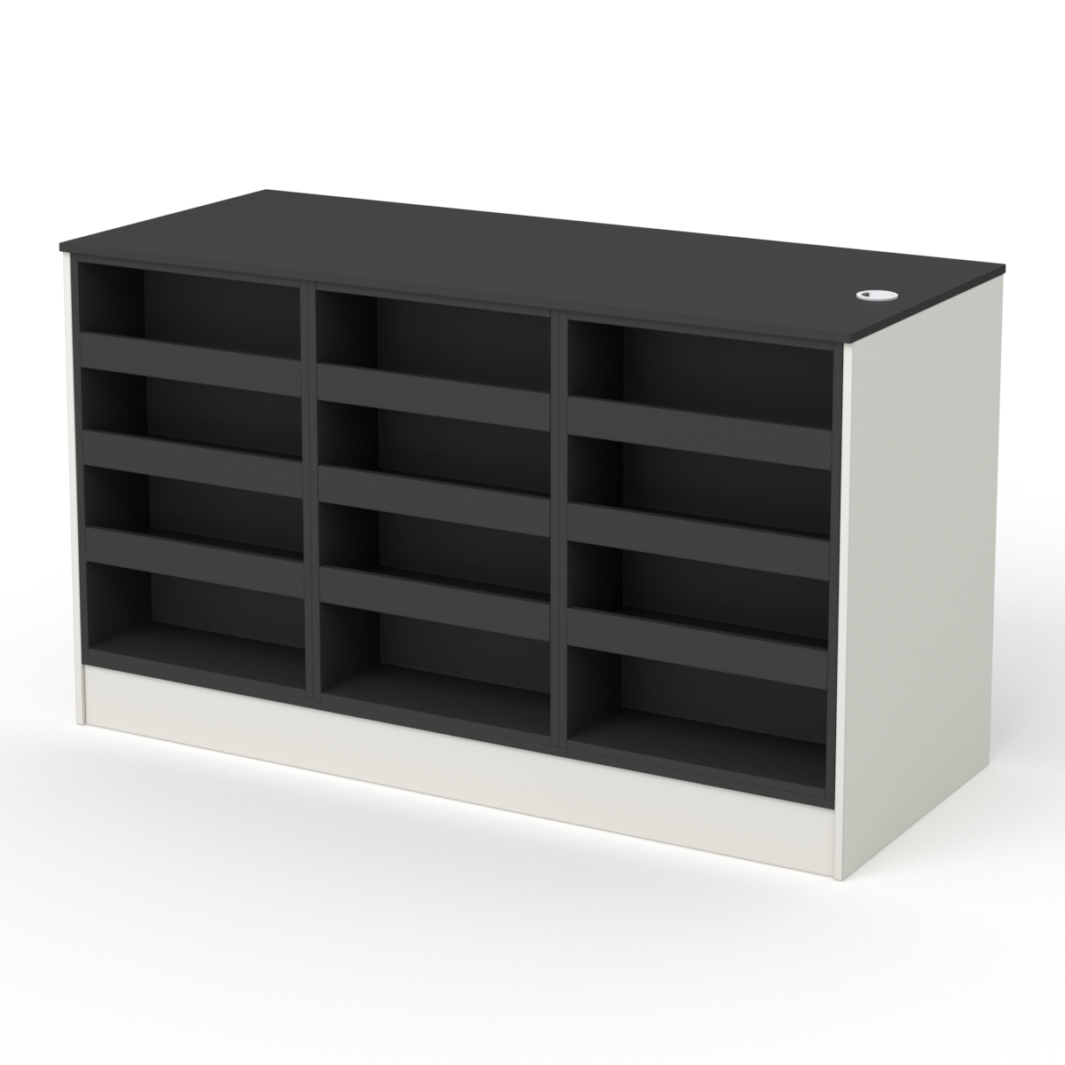 Рабочее место контролера-кассира для обслуживания покупателей. Компактная и мобильная. Внешняя сторона стола оснащена тремя модулями с дополнительными полками для выкладки небольших товаров. Внутри имеются открытые полки, где удобно хранить канцелярские принадлежности, документы и т.д.