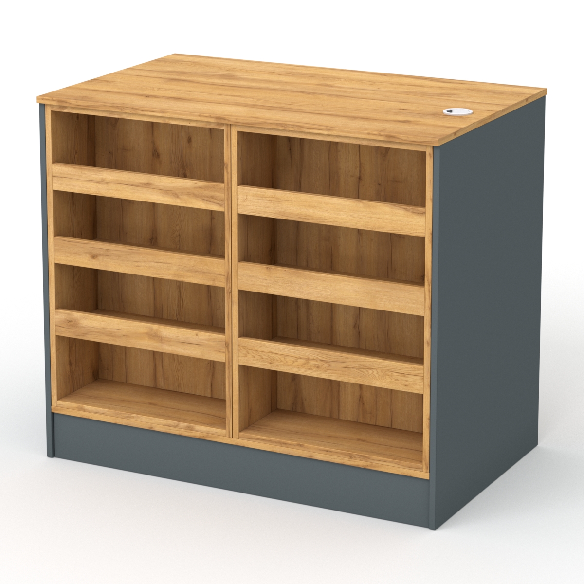 Рабочее место контролера-кассира для обслуживания покупателей. Компактная и мобильная. Внешняя сторона стола оснащена дополнительными полками для выкладки небольших товаров. Внутри имеются открытые полки, где удобно хранить канцелярские принадлежности, документы и т.д.