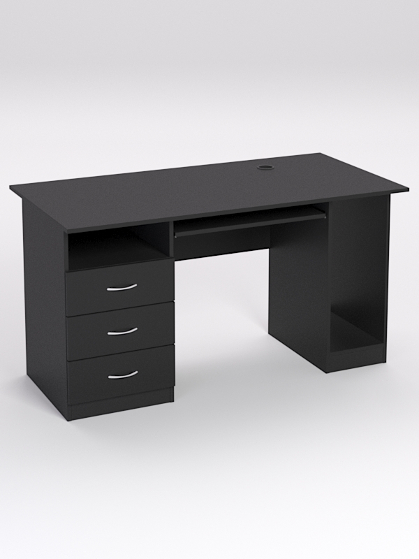 В столе с правой стороны предусмотрено место для системного блока, слева расположена тумба с 3мя выдвижными ящиками для документов. Нижняя столешница выдвижная, направляющие — шариковые. Инструкция по сборке не требуется.