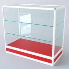 Прилавок из профиля №4 (открытый) изготавливается из алюминиевого профиля с использованием заполнителей из МДФ и стекла. Высота подиума прилавка — 15 см от пола. Прилавок комплектуется двумя стеклянными полками, которые можно регулировать по высоте. Все размеры, а также комплектация могут быть изменены по желанию заказчика. Возможно добавление полок.