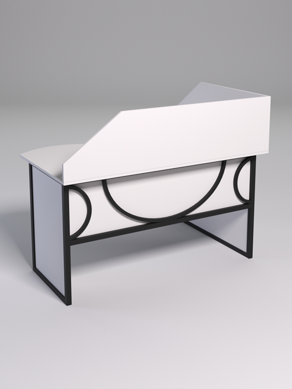 Офисный стол. Особенностью модели является наличие экрана и перегородки. Конструкция имеет специальную заглушку для компьютерных проводов. Мебель выполнена в стиле лофт с оригинальными узорами, которые по внешнему напоминают круги.