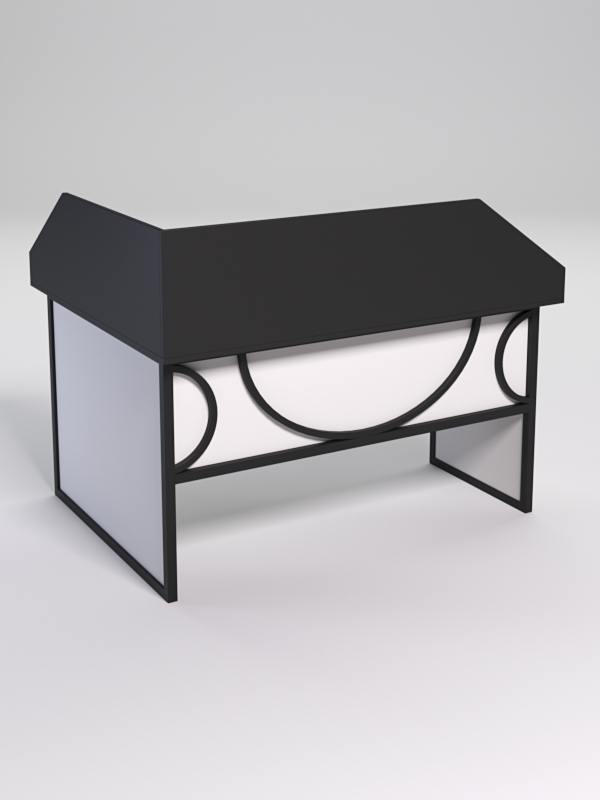 Мебель выполнена в стиле лофт. Фронтальная часть оснащена металлическими декоративными конструкциями, с оригинальным дизайном, которые напоминают три полукруга. Стиль лофт подходит для различных стилей интерьера и может быть использована как в коммерческих, так и в жилых помещениях. Столешница стола также имеет необычную волнообразную форму.