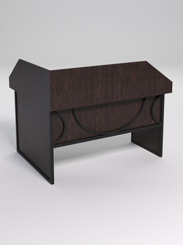 Мебель выполнена в стиле лофт. Фронтальная часть оснащена металлическими декоративными конструкциями, с оригинальным дизайном, которые напоминают три полукруга. Стиль лофт подходит для различных стилей интерьера и может быть использована как в коммерческих, так и в жилых помещениях. Столешница стола также имеет необычную волнообразную форму.
