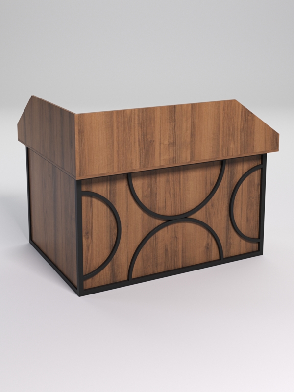 Мебель выполнена в стиле лофт. Фронтальная часть оснащена металлическими декоративными конструкциями, с оригинальным дизайном, который напоминает четыре круга. Стиль лофт подходит для различных стилей интерьера и может быть использована как в коммерческих, так и в жилых помещениях. Столешница стола также имеет необычную волнообразную форму. У данной конструкции расположена царга до пола.