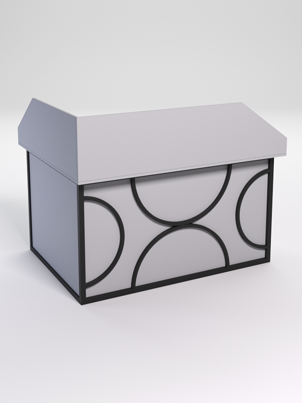 Мебель выполнена в стиле лофт. Фронтальная часть оснащена металлическими декоративными конструкциями, с оригинальным дизайном, который напоминает четыре круга. Стиль лофт подходит для различных стилей интерьера и может быть использована как в коммерческих, так и в жилых помещениях. Столешница стола также имеет необычную волнообразную форму. У данной конструкции расположена царга до пола.