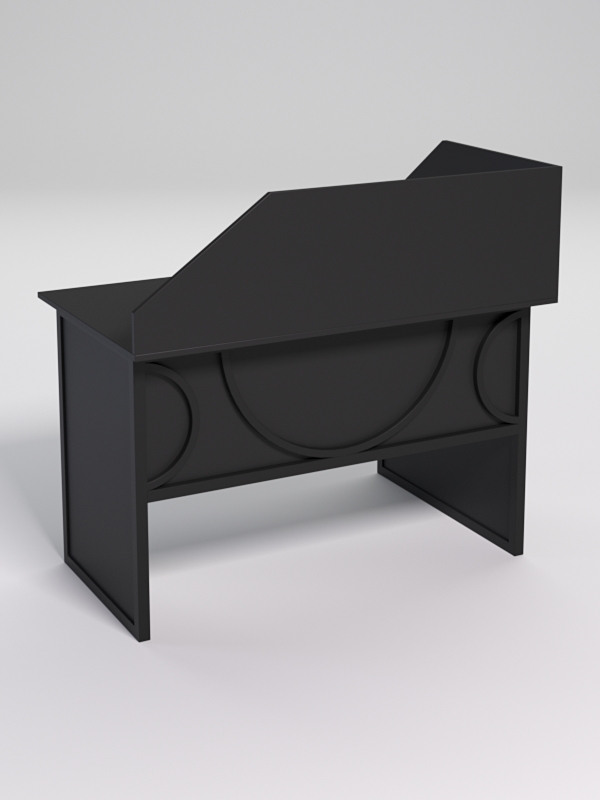 Мебель выполнена в стиле лофт. Фронтальная часть оснащена металлическими декоративными конструкциями, три круга. Стиль лофт подходит для различных стилей интерьера и может быть использована как в коммерческих, так и в жилых помещениях. Столешница стола также имеет необычную волнообразную форму.