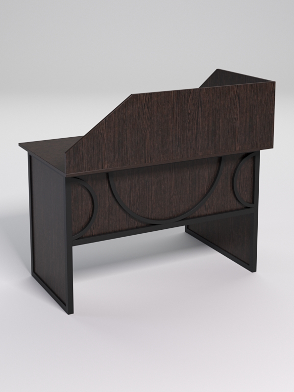 Мебель выполнена в стиле лофт. Фронтальная часть оснащена металлическими декоративными конструкциями, три круга. Стиль лофт подходит для различных стилей интерьера и может быть использована как в коммерческих, так и в жилых помещениях. Столешница стола также имеет необычную волнообразную форму.