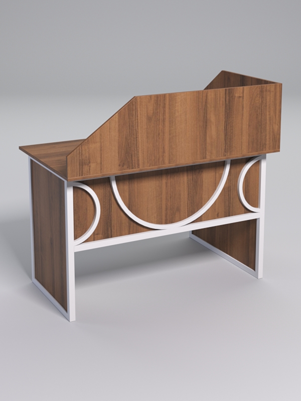 Мебель выполнена в стиле лофт. Фронтальная часть оснащена металлическими декоративными конструкциями, три круга. Стиль лофт подходит для различных стилей интерьера и может быть использована как в коммерческих, так и в жилых помещениях. Столешница стола также имеет необычную волнообразную форму.